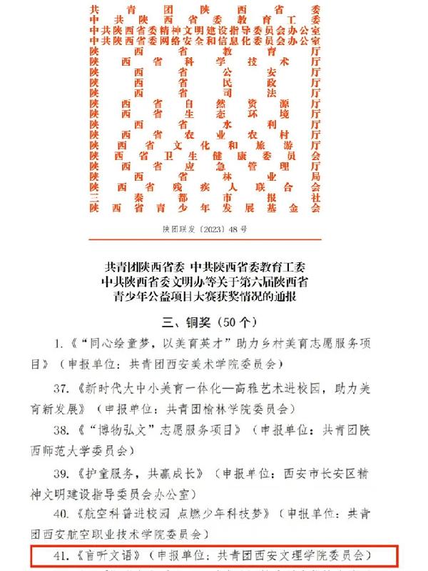 近日,在团省委、省委教育工委、省委文明办等单位的共同推动下,我校“盲听文语”志愿服务项目荣获第六届陕西省青少年公益项目大赛铜奖。