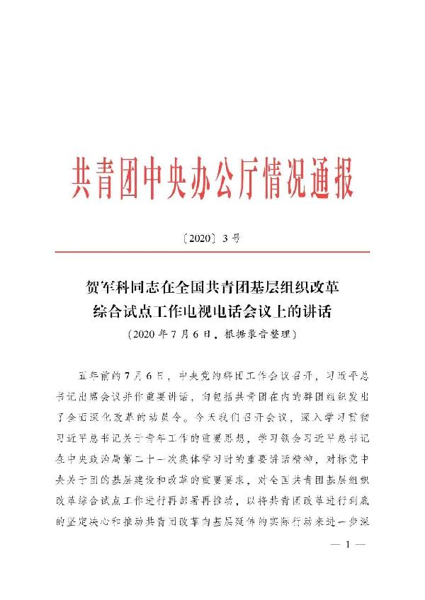 2020年7月6日,全国共青团基层组织改革综合试点工作电视电话会议召开。团中央书记处第一书记贺军科同志出席会议并讲话。本次会议深入学习贯彻了习近平总书记关于青年工作的重要思想, 学习领会了习近平总书记在中央政治局第二十一次集体学习时的重要讲话精神。